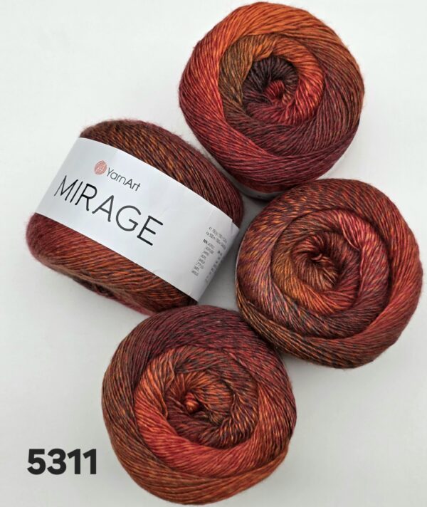 YarnArt Mirage – spalvingi ir švelnūs ploni siūlai mezgimui, derinantys vilnos šilumą ir akrilo lengvumą. Tai itin minkšti ir patvarūs siūlai, kurie puikiai tinka lengviems, spalvingiems mezginiams. Ilgo metražo kamuolys leis megzti didesnius projektus su mažiau jungimų.