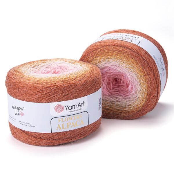 YarnArt Flowers Alpaca – tai prabangūs, itin švelnūs ombre tipo siūlai, kuriuose susilieja natūralus alpakos pūko šiltumas ir akrilo lengvumas. Ilgi spalvų perėjimai sukuria išskirtinį „gėlių žiedo“ efektą, todėl megztiniai, skaros, šaliai ar pončai atrodo tarsi nudažyti akvarele.